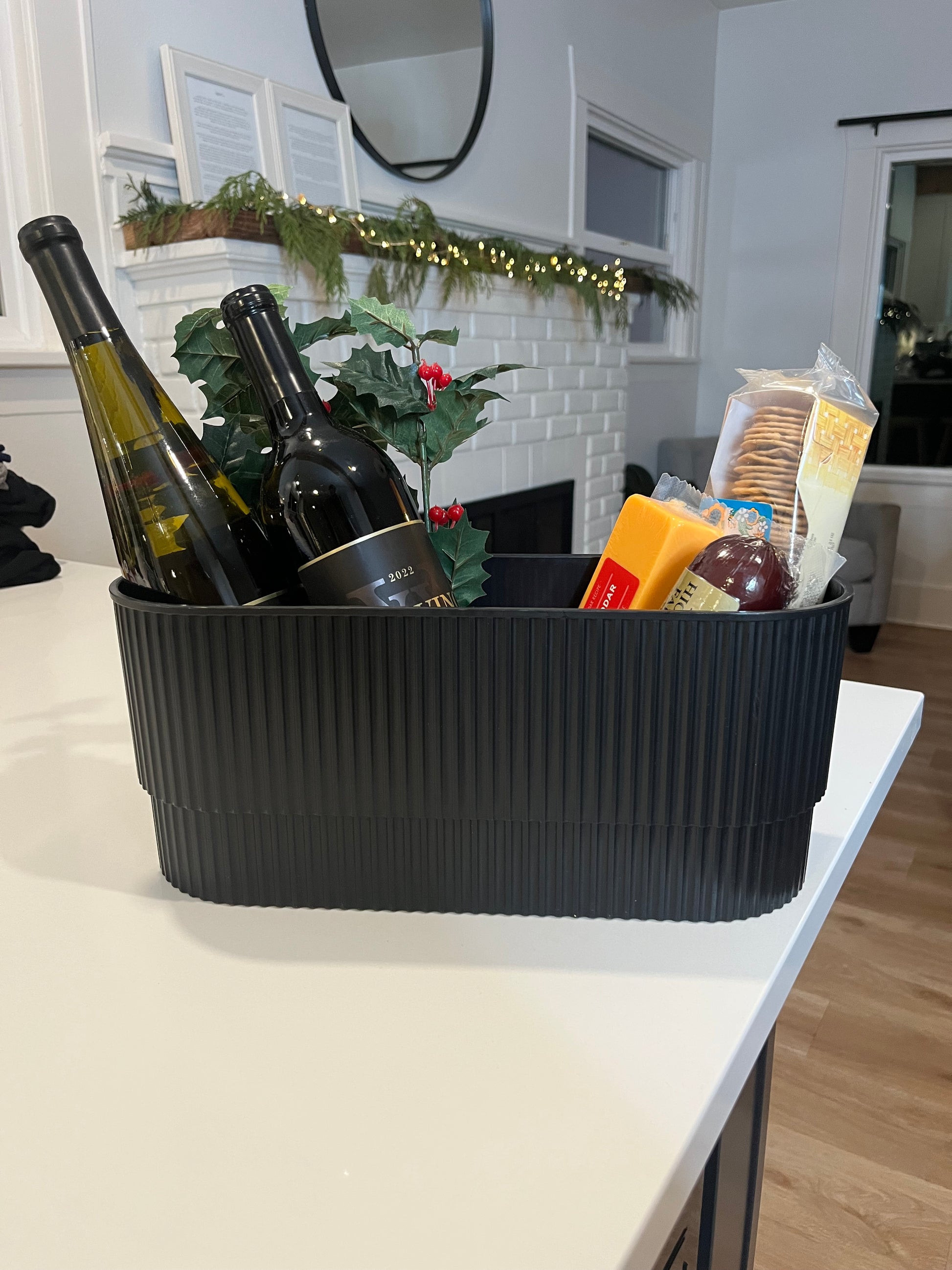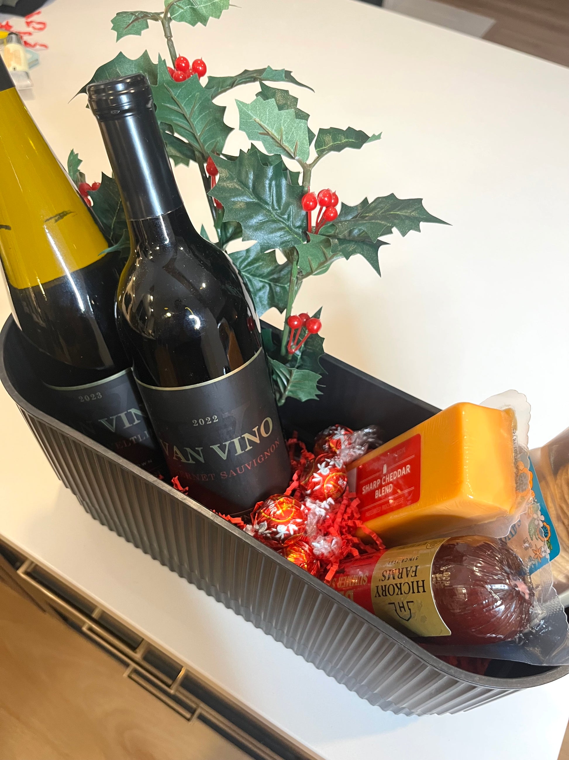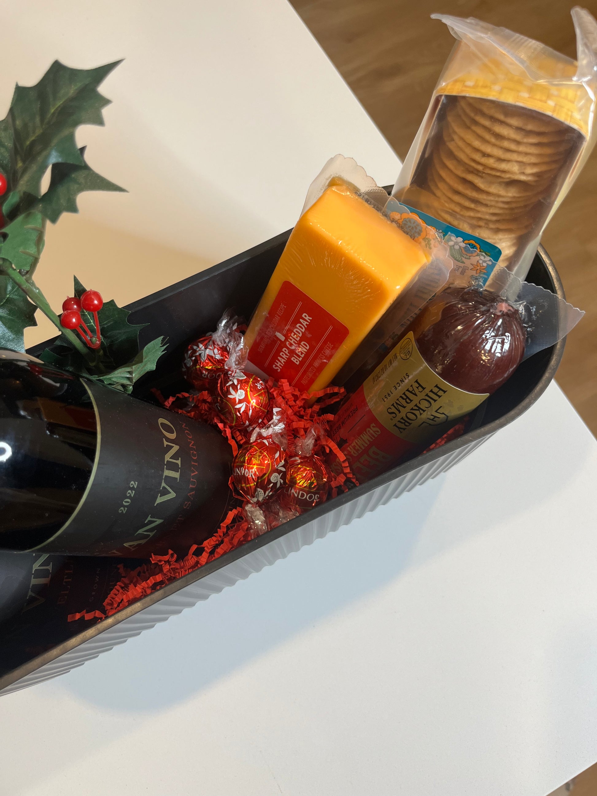 A bottle of our most popular white & red wine, hickory farms meat and cheese as well as crackers and chocolate. The perfect pairing.